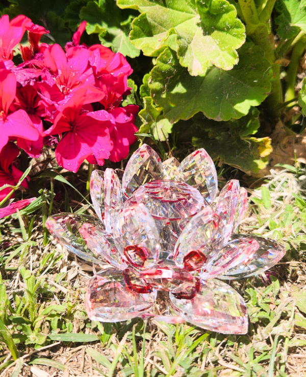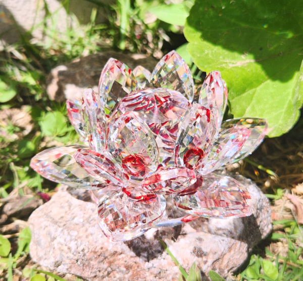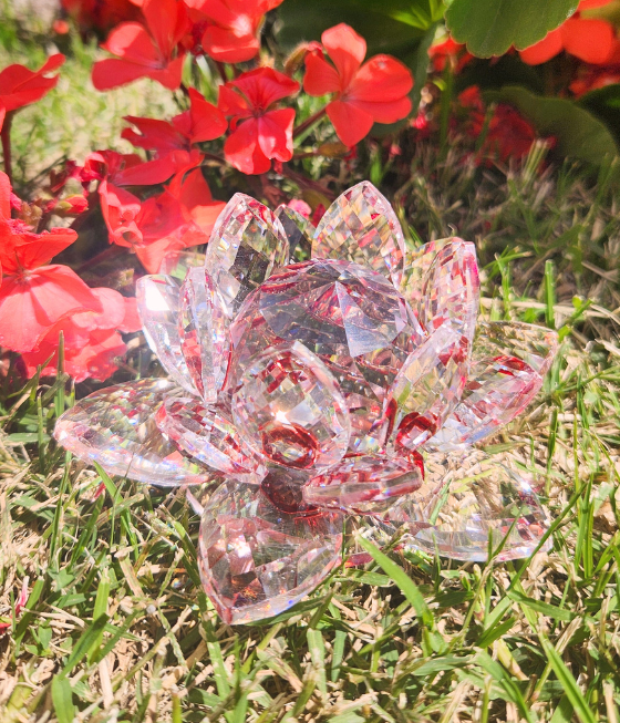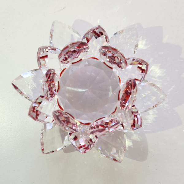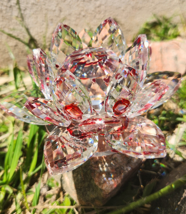 Esta flor de loto de cristal de 9 cm irradia belleza y armonía: cuando la luz del sol o una lámpara la alcanza, sus facetas reflejan destellos de color que llenan de brillo y energía el ambiente.