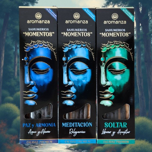 Pack de Sahumerios Aromanza Linea Momentos. Incluye 3 cajas y un porta sahumerios de madera de regalo!