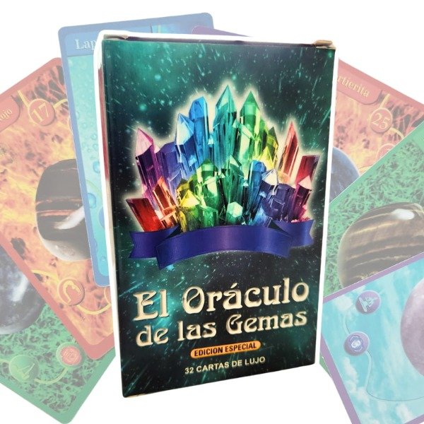 Cada una de sus 32 cartas está dedicada a una gema diferente, ilustrada e identificada con su elemento correspondiente, invitándote a explorar su vibración y el mensaje que trae a tu vida.