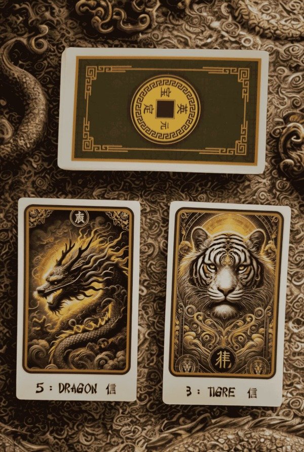 Este mazo incluye una moneda antigua de dragón de la suerte, símbolo de abundancia y protección, que podés usar en tus rituales o como amuleto personal.