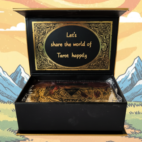 Incluye una caja estuche resistente, pensada para proteger las cartas y mantenerlas en perfecto estado, incluso con su formato panorámico. Su diseño acompaña la estética clásica y elegante del mazo, manteniendo una presentación cuidada y de nivel premium.