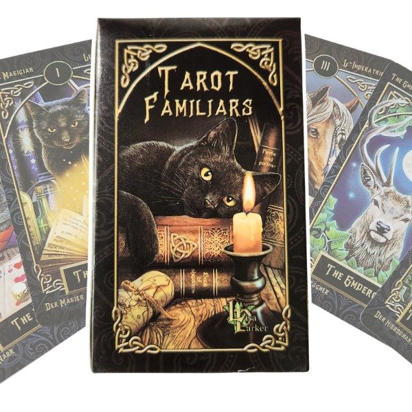 Una obra encantadora creada por la artista británica Lisa Parker, mundialmente conocida por sus ilustraciones mágicas donde animales, naturaleza y simbolismo esotérico se fusionan de manera exquisita. Esta baraja es una invitación a entrar en un mundo donde los animales guardianes, los “familiars” de la tradición brujeril, actúan como guías, protectores y mensajeros.