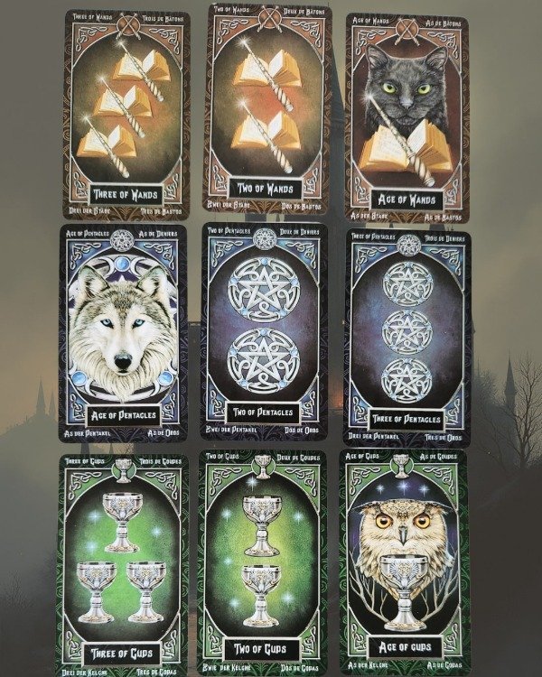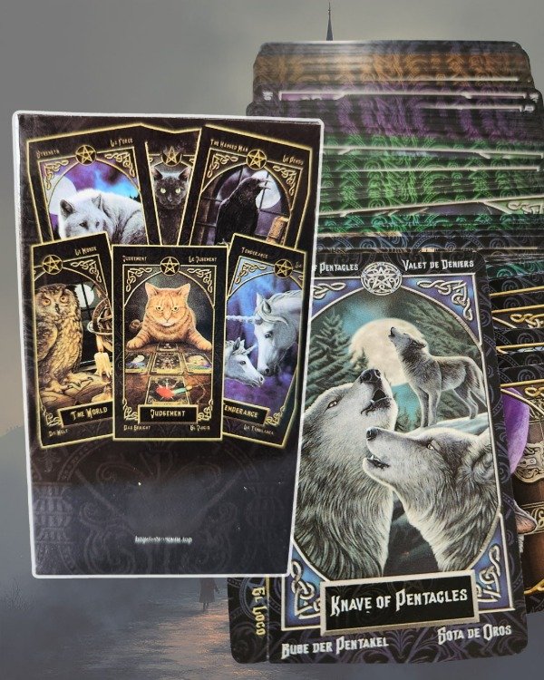 Cada una de sus cartas está ilustrada con un nivel de detalle impresionante: gatos negros que encarnan la intuición, lobos que revelan la fuerza interior, búhos que custodian antiguos conocimientos, ciervos que representan nobleza y claridad espiritual. A través de estos seres totémicos, la baraja transmite una energía profunda, cargada de simbolismo ancestral.
