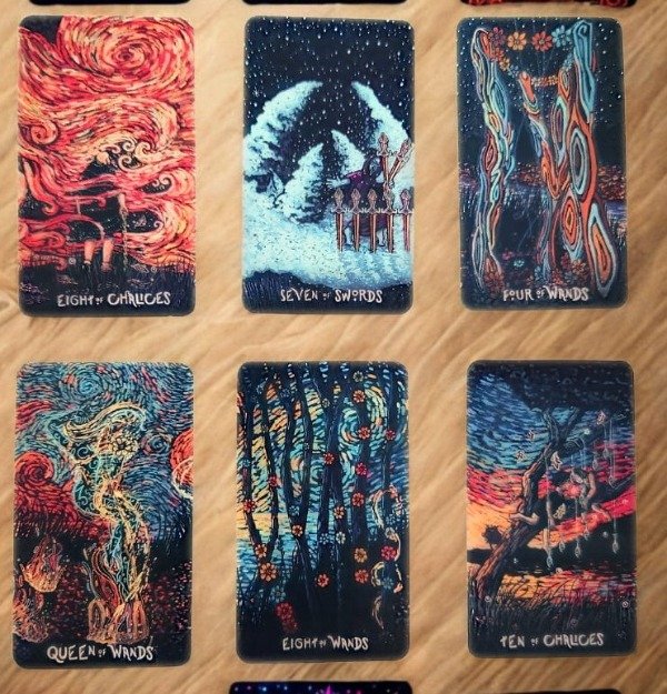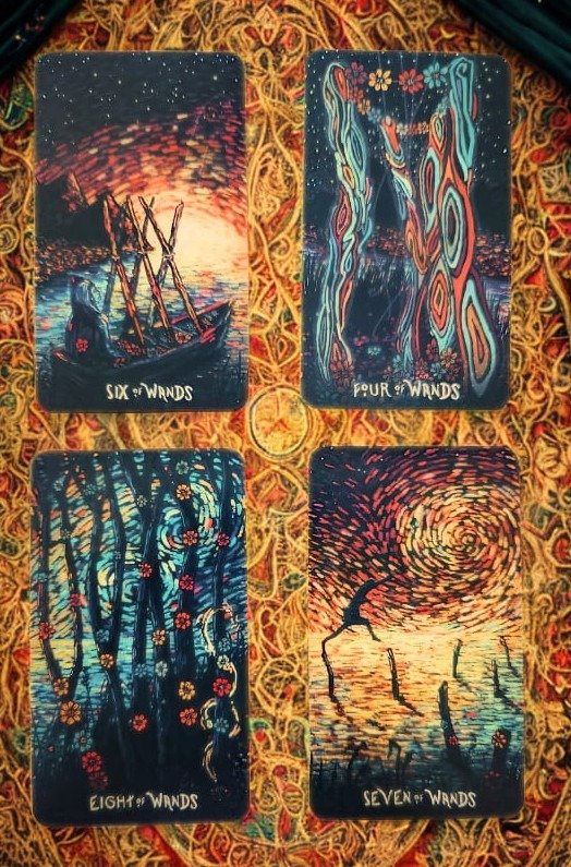 Los arcanos menores cuentan una historia panorámica: al alinear las 14 cartas de cada palo, se forma una única imagen continua, como si cada carta fuera un fragmento de un gran mural. Esta idea transforma cada lectura en una experiencia inmersiva y casi cinematográfica.