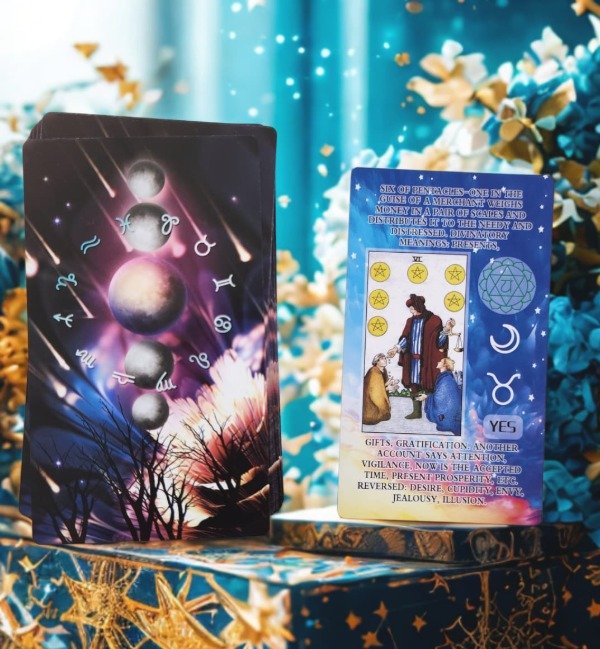 Este mazo destaca por su diseño vibrante y moderno, incorporando en cada arcano los signos y elementos astrológicos, lo que lo hace perfecto para lecturas combinadas de tarot y astrología.