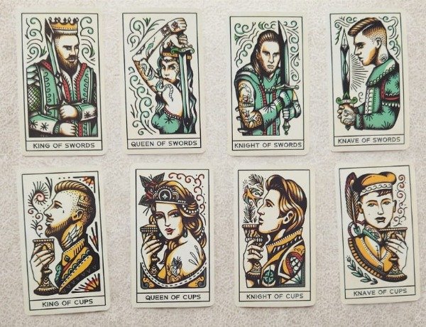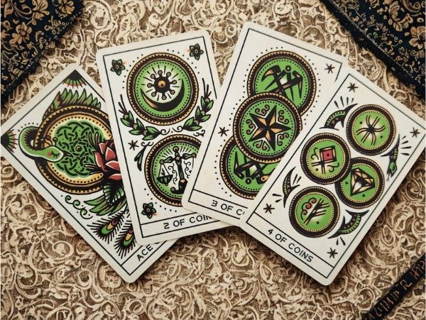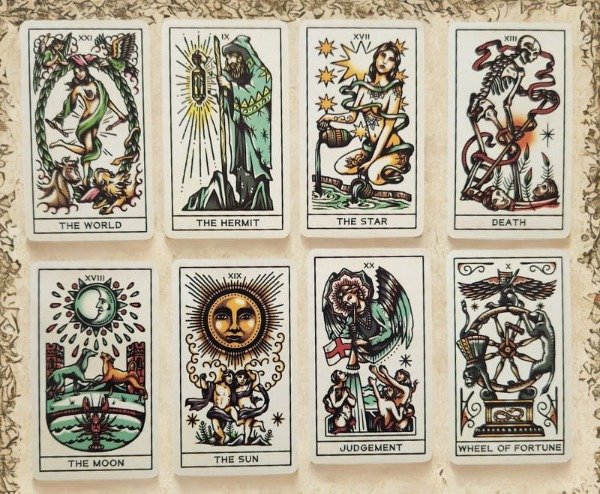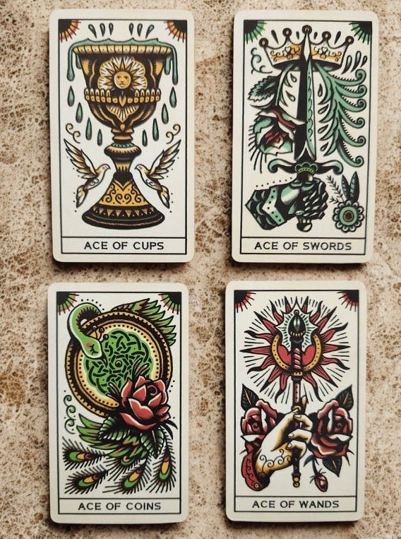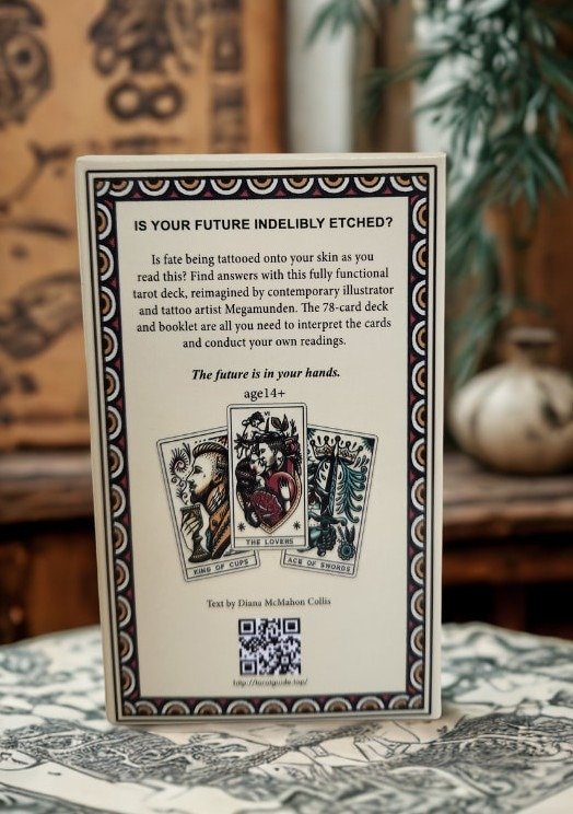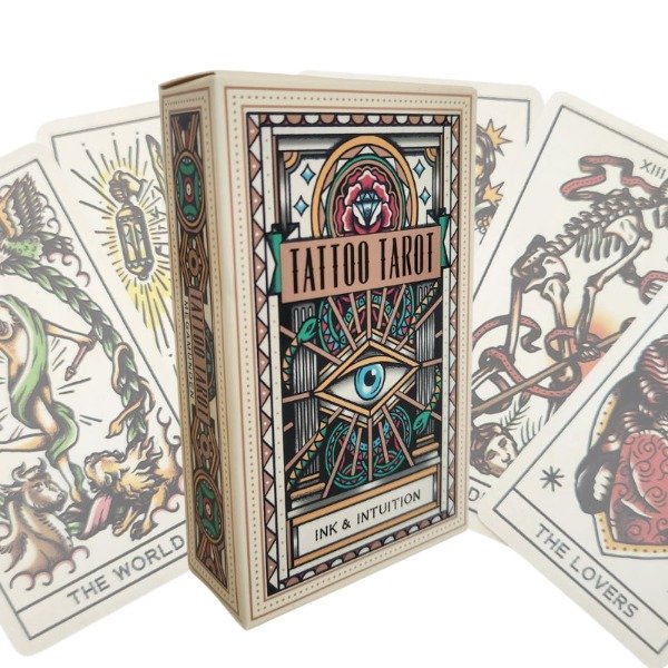 Sumergite en una baraja que fusiona la estética clásica del tarot marsellés con el arte vibrante del tatuaje old-school. Cada carta es una pequeña obra de arte con diseños inspirados en tatuajes vintage: rosas, calaveras, dagas, corazones, filigranas y símbolos cargados de energía mística.