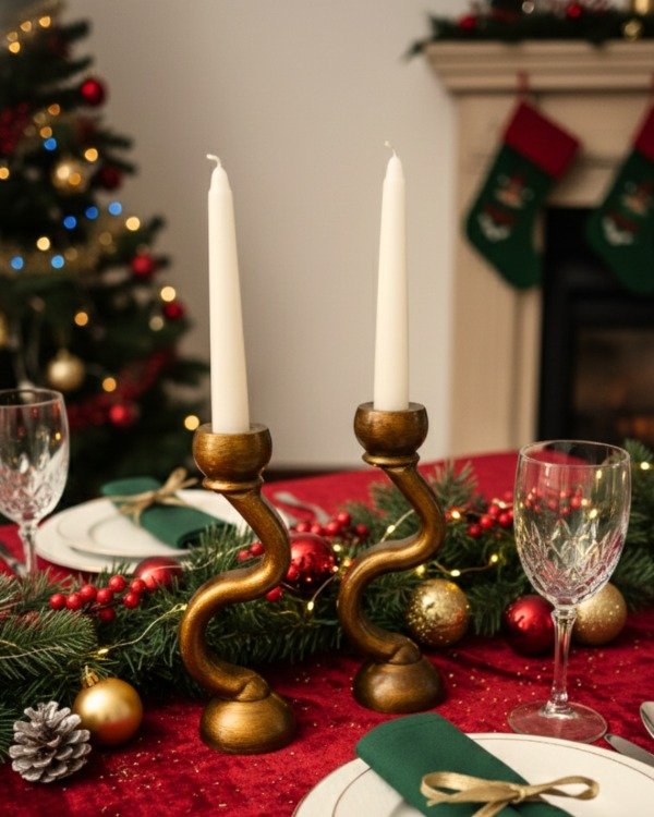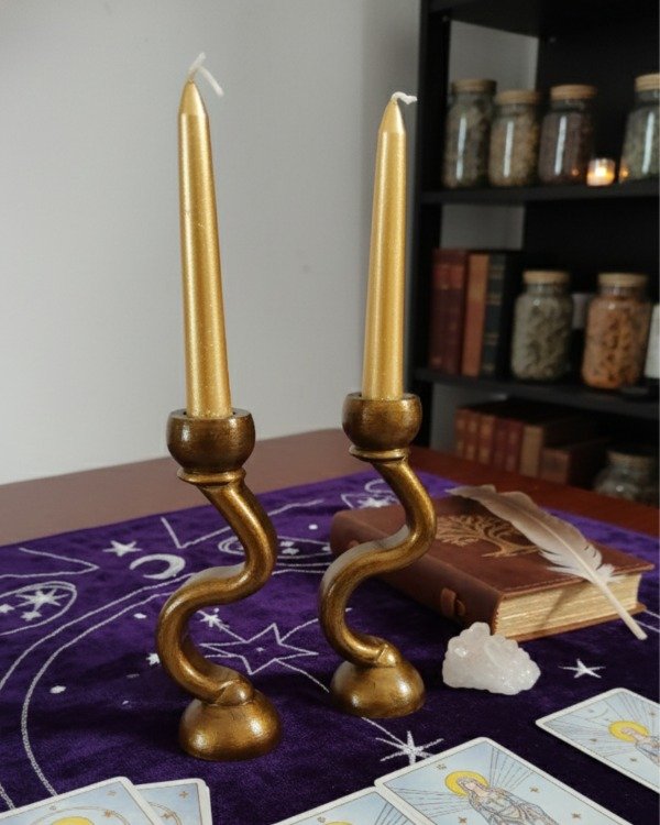 Estos candelabros fueron diseñados íntegramente por mí y luego impresos en 3D en PLA+, un material resistente y liviano. Cada uno está pintado a mano con acrílicos, pátinas envejecidas y sellado con barniz, logrando este efecto de bronce antiguo que les da un aire mágico, como si hubieran salido de un altar antiguo o de la estantería de una hechicera moderna.