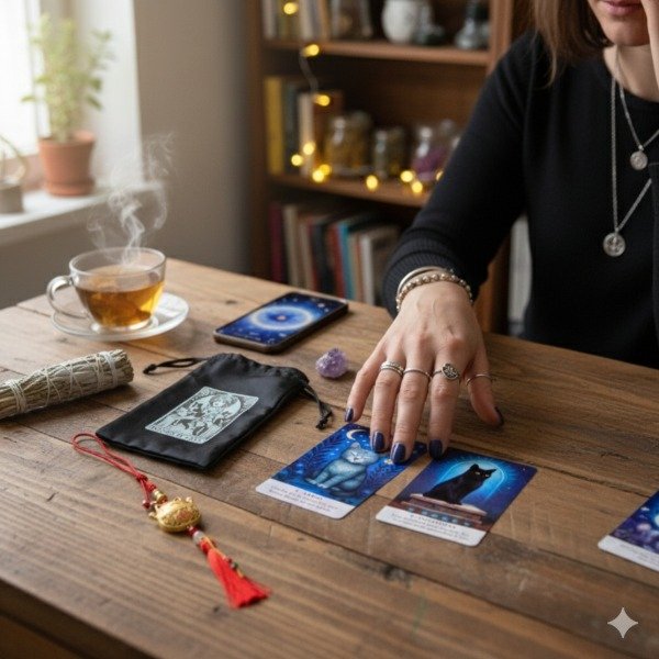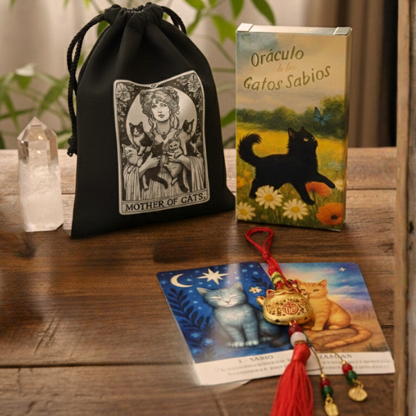 Visualizalo: tu mesa ritual, el aroma de tu sahumo favorito, las cartas del Oráculo de los Gatos Sabios brillando bajo la luz tenue, tu bolsita “Madre de Gatos” descansando a un lado, y el Maneki Neko acompañando la escena con buena energía.