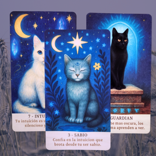 Cada carta es una mezcla de intuición, magia suave y escenas gatunas que hablan de descanso, curiosidad, protección y guía interior. Ideal para tiradas rápidas, rituales lunares o para recibir un mensaje dulce al iniciar el día.